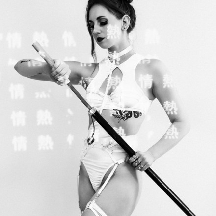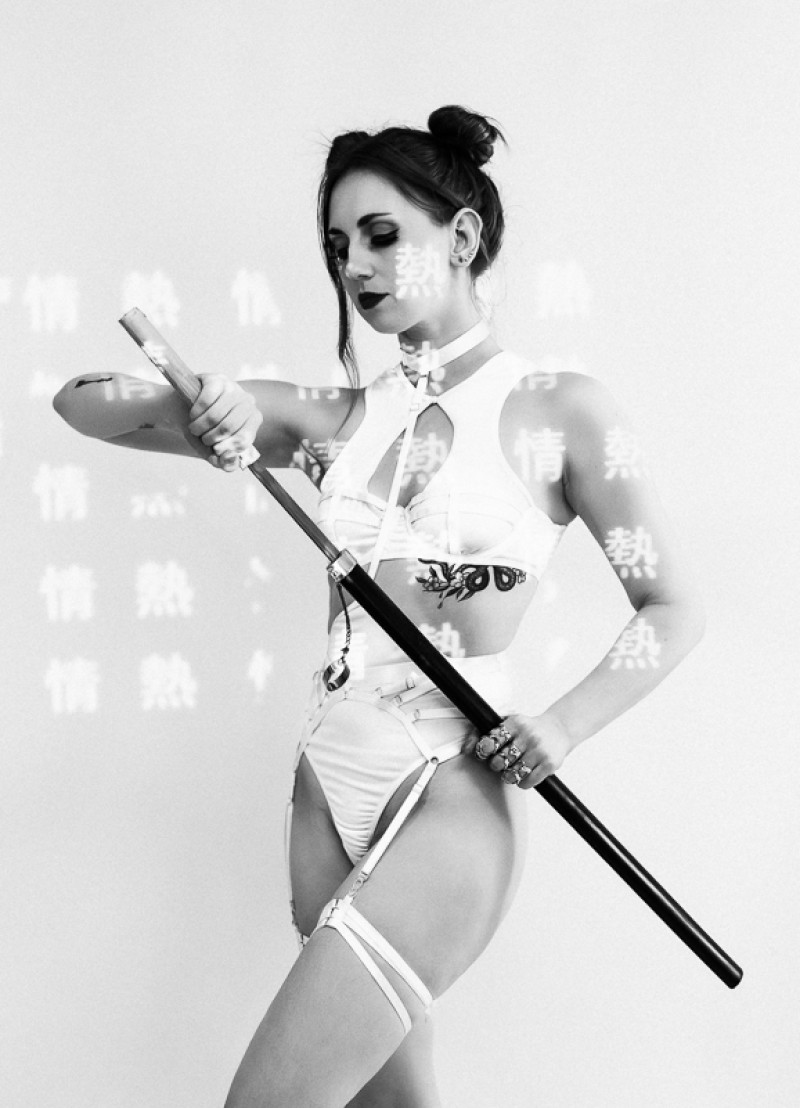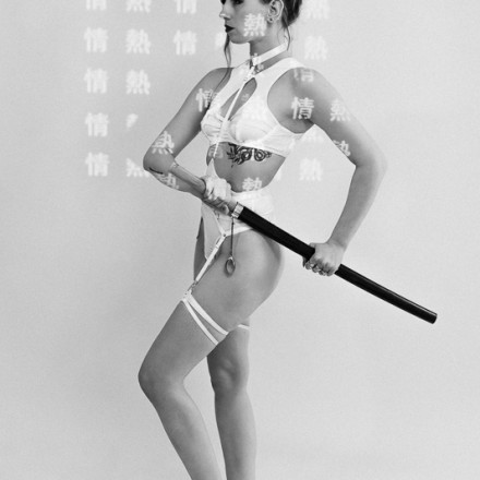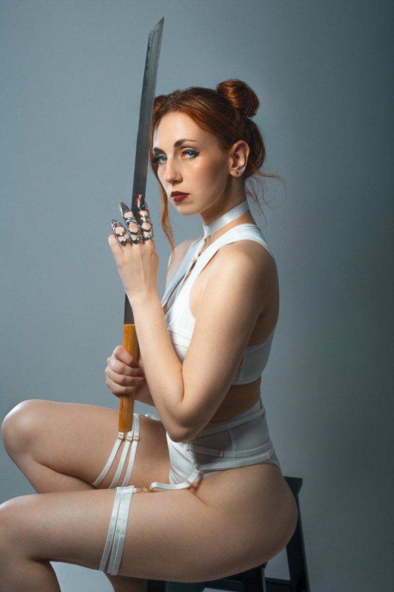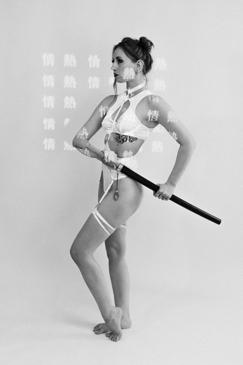Le katana, plus qu’un simple accessoire, est l’élément central de ce shooting. Il incarne la puissance, la discipline et la maîtrise de soi. Dans les poses, le modèle manipule l’arme avec assurance, rappelant la force d’une guerrière moderne, indépendante et déterminée.